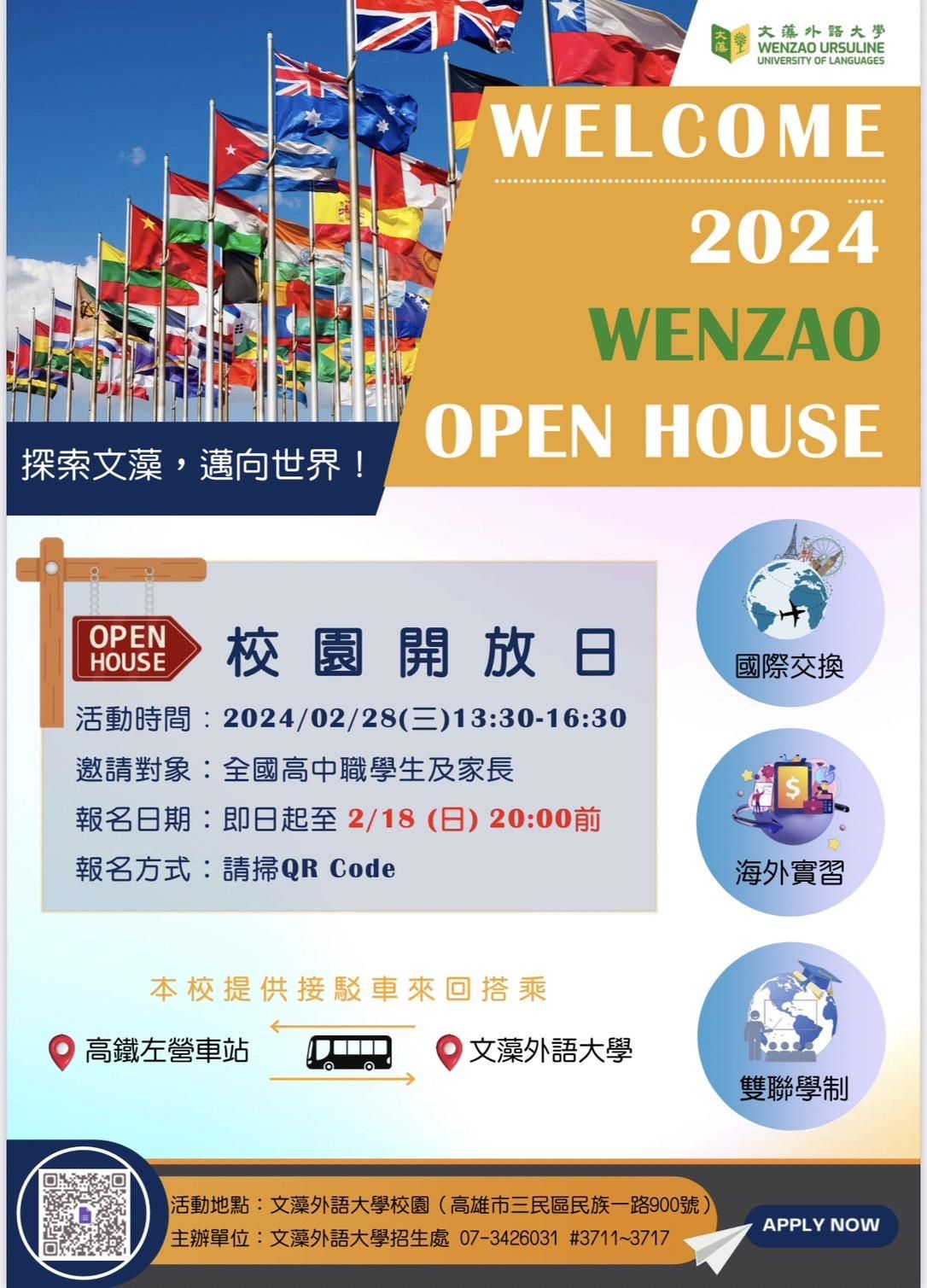 文藻外語大學將於2024年2月28日(星期三)辦理校園開放日,歡迎有興趣的同學及家長踴躍報名參加!